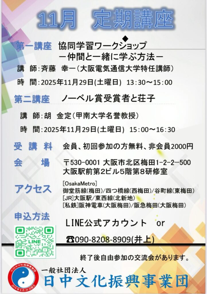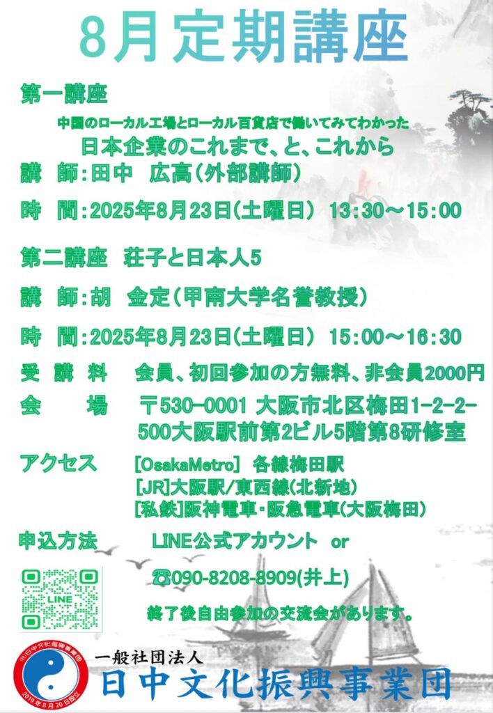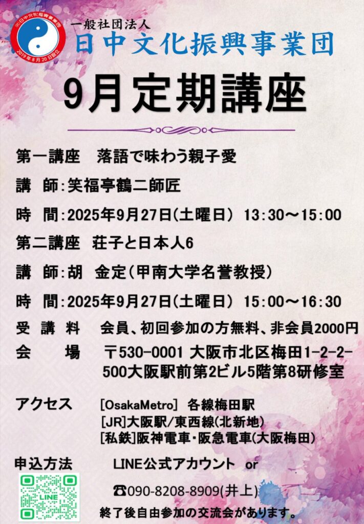 ◎(一社)日中文化振興事業団では、(一社)豊中市日本中国友好協会、(一社)関西日中平和友好会との共同開催で、「中国古典から学ぶ」を開催しております。