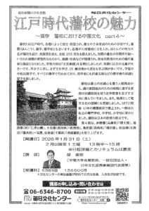 毎日文化センターで「江戸時代藩校の魅力」講座が開催されます。当事業団の胡金定代表理事が講師を務め、「漢学 藩校における中国文化 part4」としての開催です。江戸時代、全国に255校あったと言われる藩校では「文武兼備」を […]